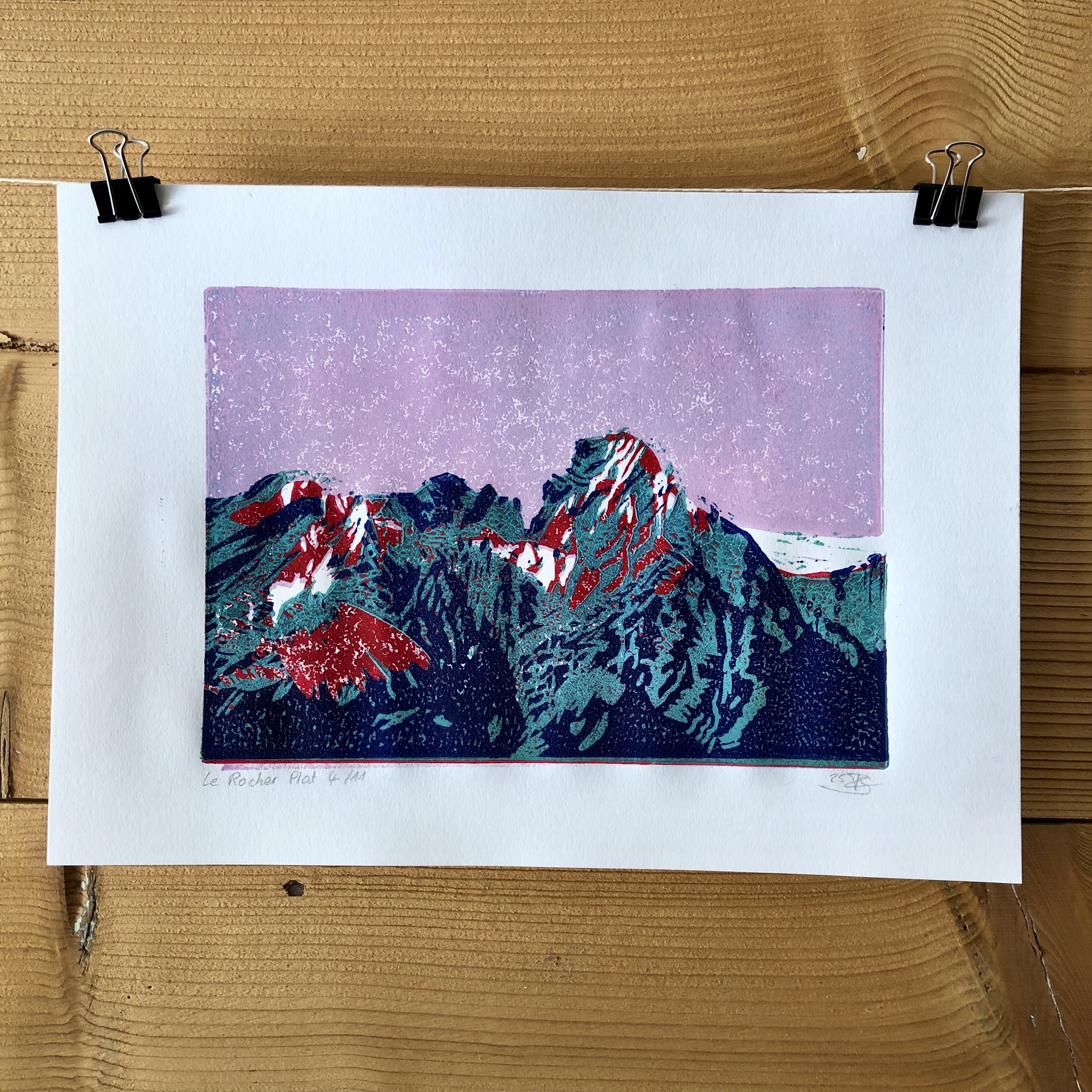 Linogravure A4 à plusieurs couches représentant le Rocher Plat vu depuis Rossinière.