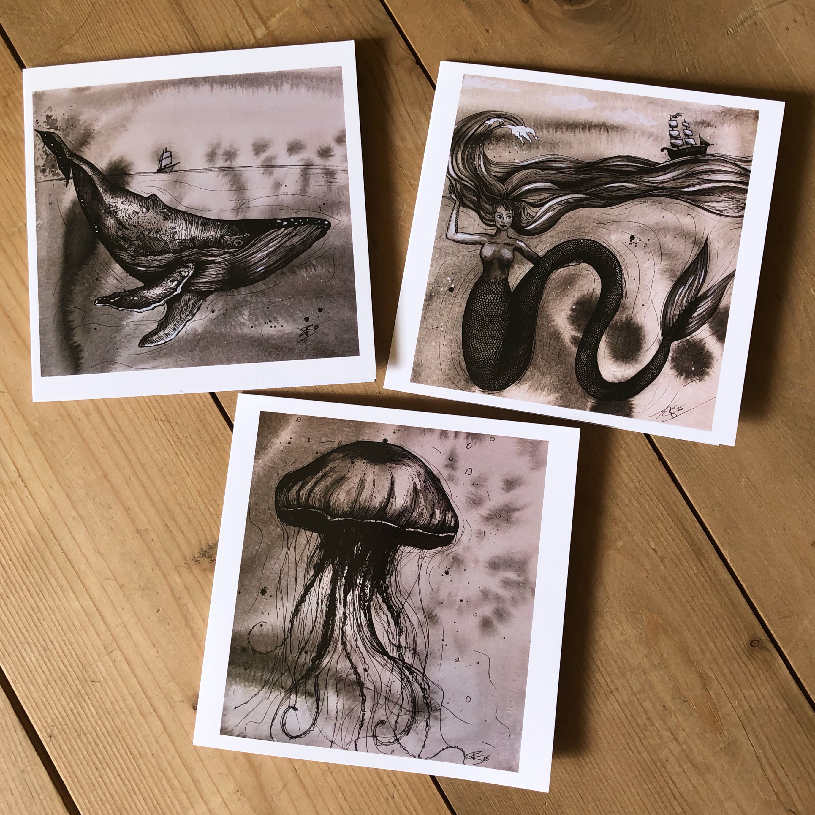 Encres de Chine imprimées sur papier glacé : la baleine, la méduse, la sirène.