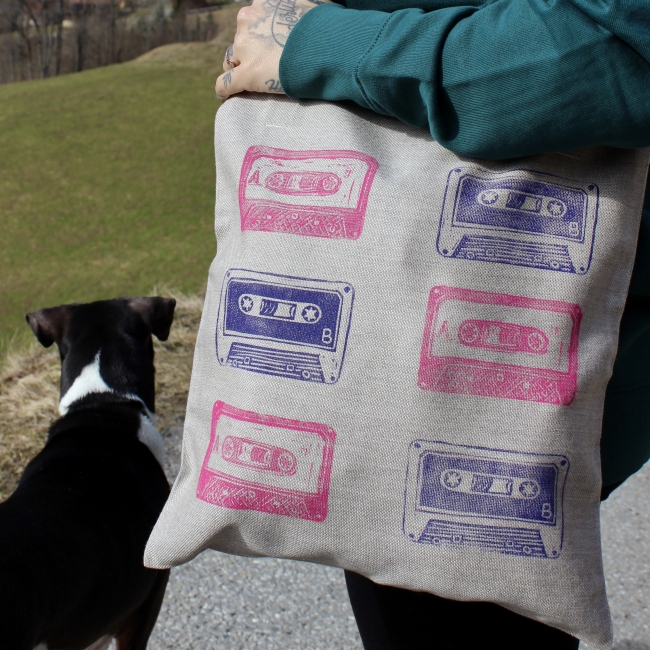 Sac en toile cousu main dans un tissu d’ameublement solide, impression linogravure.