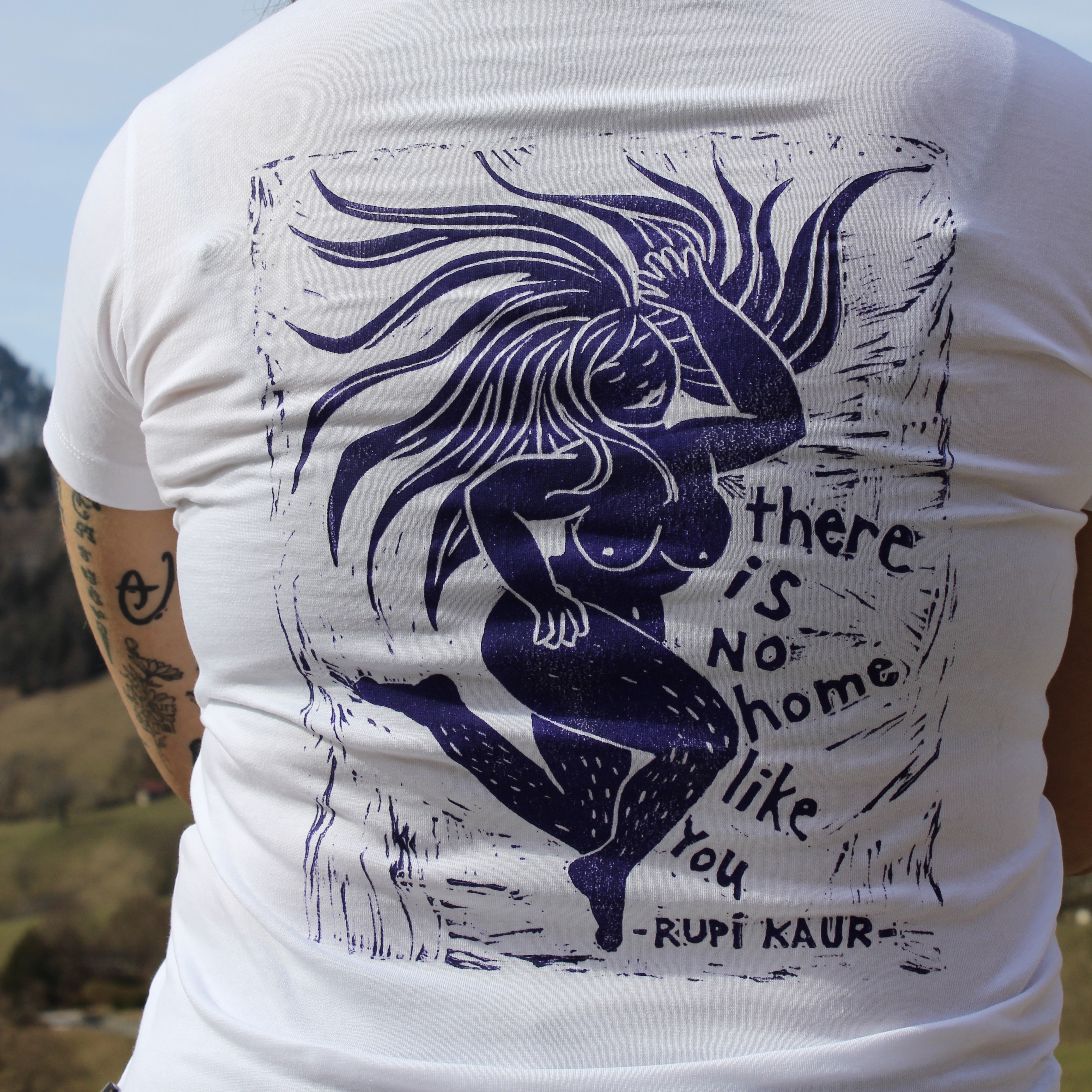 T-shirt qualité Switcher, avec linogravure « There is no home like you » (Phrase de la poétesse Rupi Kaur) au dos.