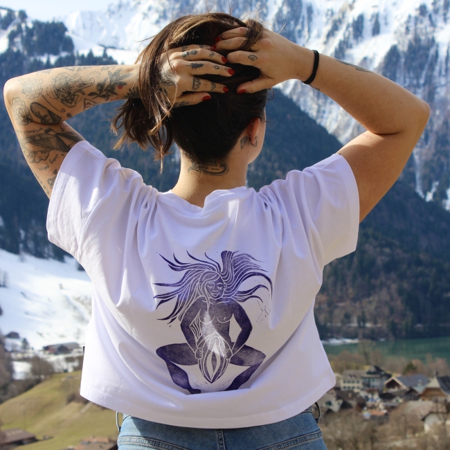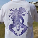 T-shirt court avec linogravure Sheela-Na-Gig (figure féminine venant des îles britanniques) au dos.