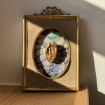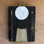 Vulve modelée et dorée, tissu et cadre récupérés.